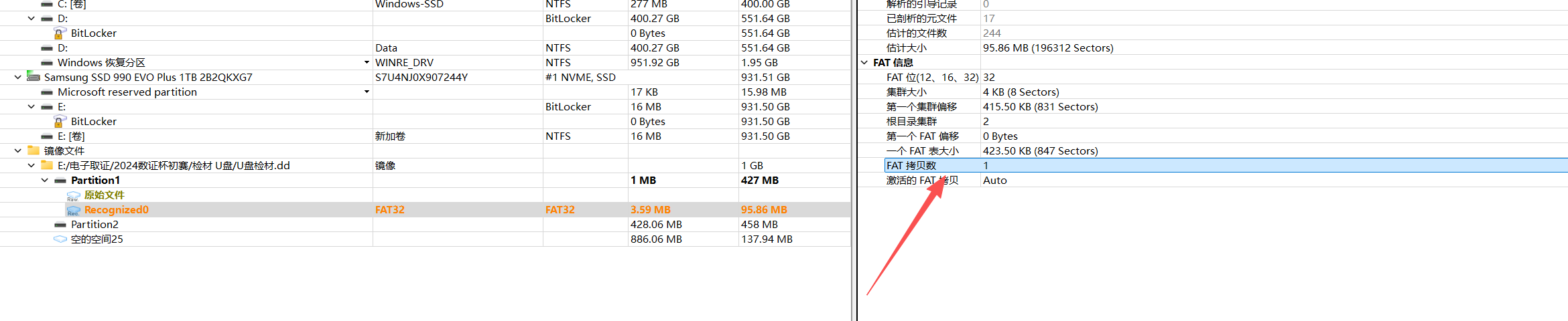 26.[填空题] 对U盘镜像进行分析,其中FAT32主分区的FAT表数量有几个?(请使用十进制数方式填写答案,答案格式:1234)(2分)