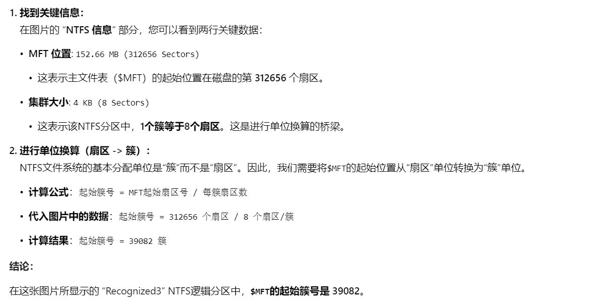 30.[填空题] 对U盘镜像进行分析,其中NTFS逻辑分区的$MFT起始簇号为?(请使用十进制数方式填写答案,答案格式:1234)(2分)